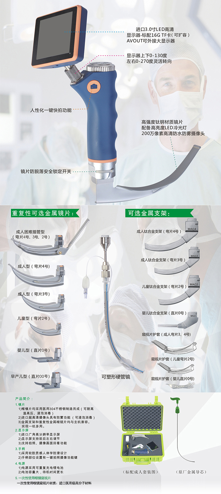 3)金属支架和重复性金属喉镜片均与主机兼容,实现一机多用。